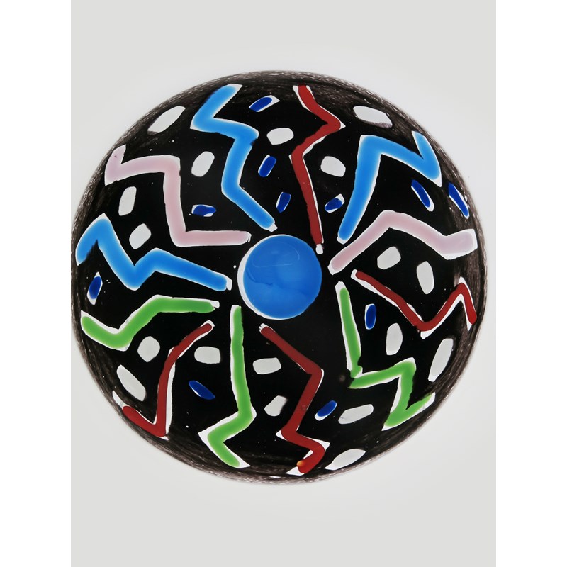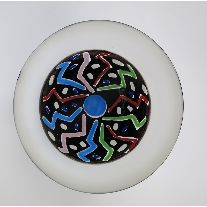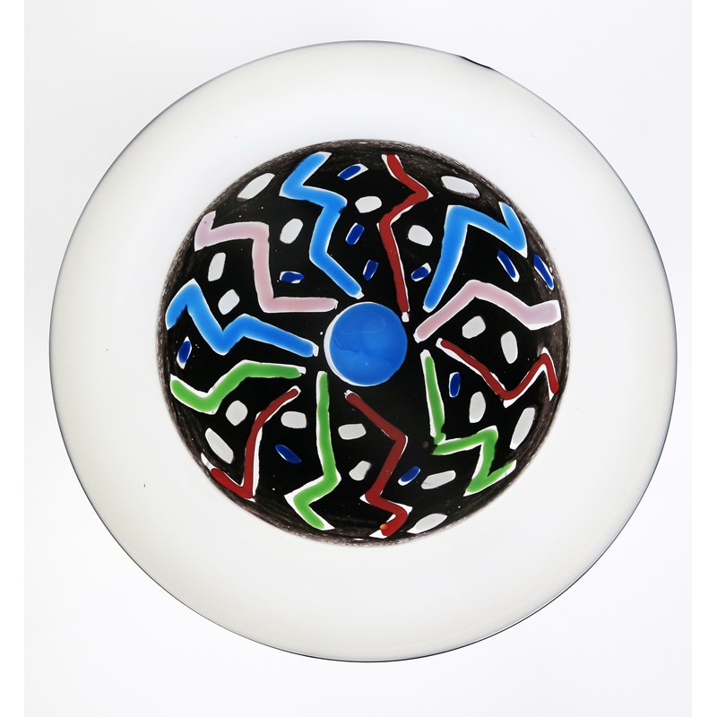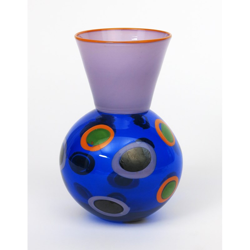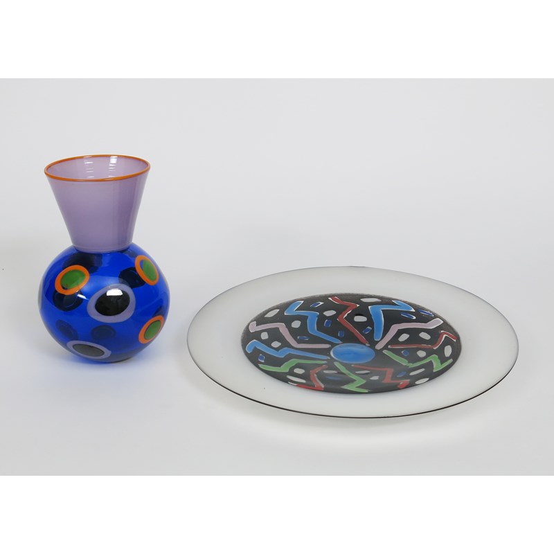 A glass vase by Simon Moore dated 1985, ovoid blue glass body with orange and purple circles, highlighted with green, with flaring purple neck and orange rim, and a glass charger by Simon Moore made at The Glasshouse in 1984, etched marks, 24.5cm. high
