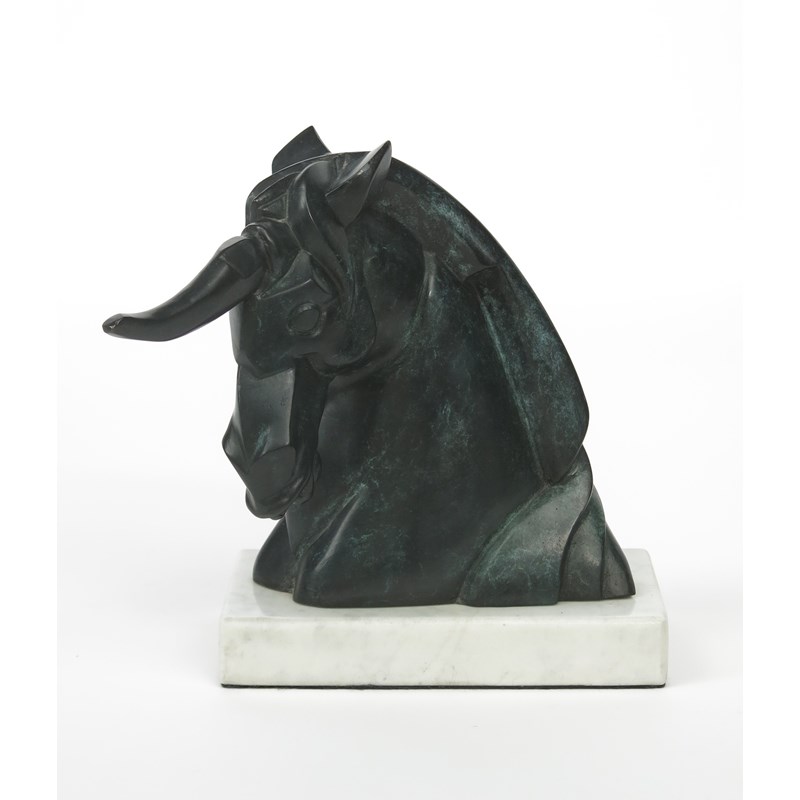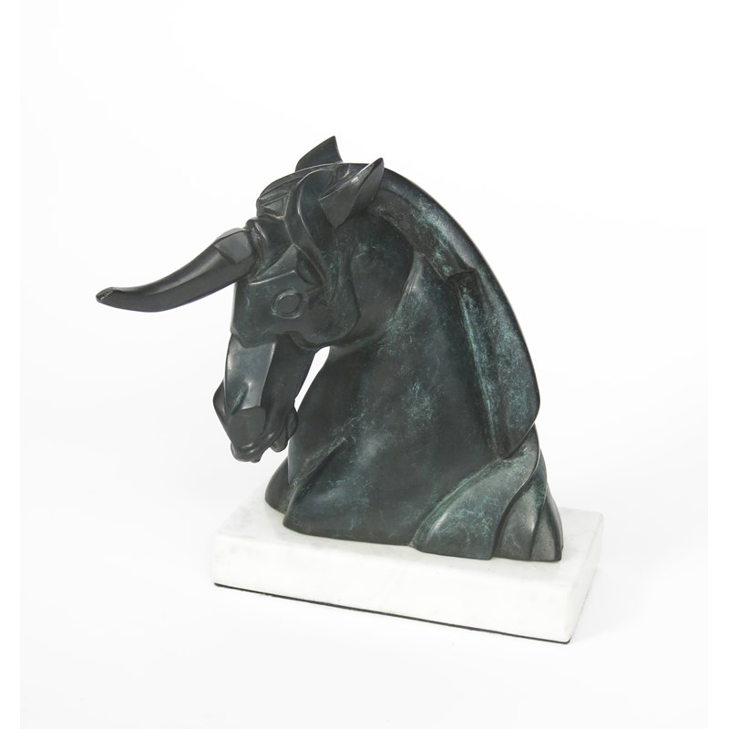 A verdi gris patinated bronze bust of a unicorn, on white veined polished marble base, numbered 1/36 indistinct monogram 23cm. high