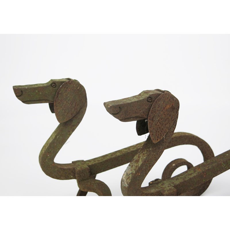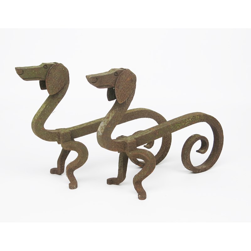 A pair of patinated iron fire dogs probably designed by Edouard Schenck, each modelled as a stylised dachsund, unsigned, 43cm. wide (2)