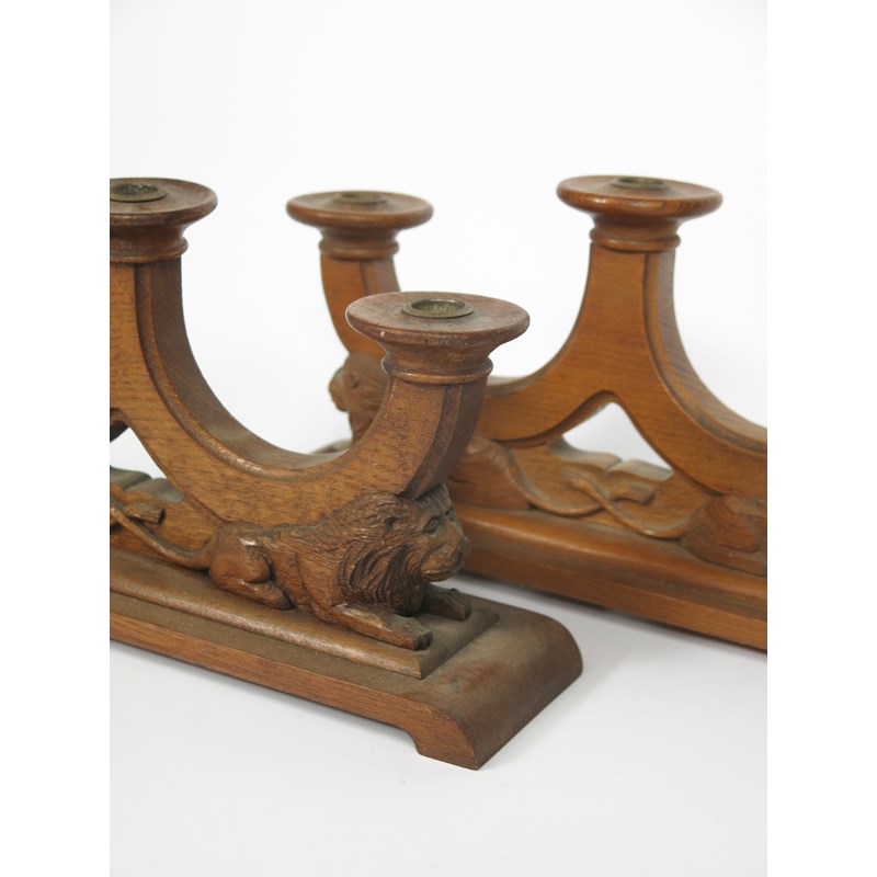 A pair of carved wood candelabra, the three sconces supported on two carved lions, unsigned, 39.5cm. wide