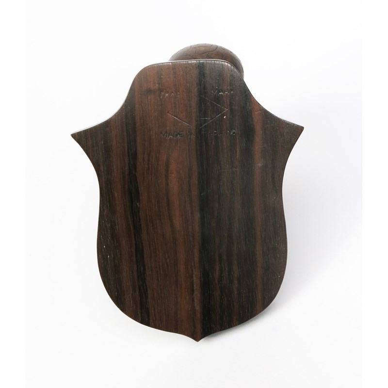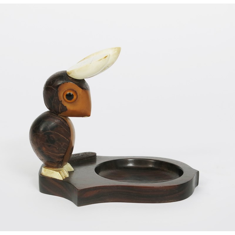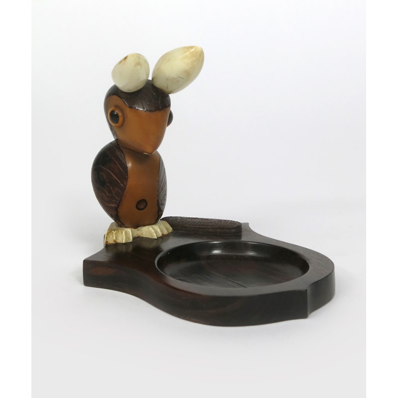 A Henry Howell & Co YZ rabbit vesta, exotic wood with 'white phenolic resin' ears and feet and glass eyes, on macassar ebony tray impressed marks, 10cm. high