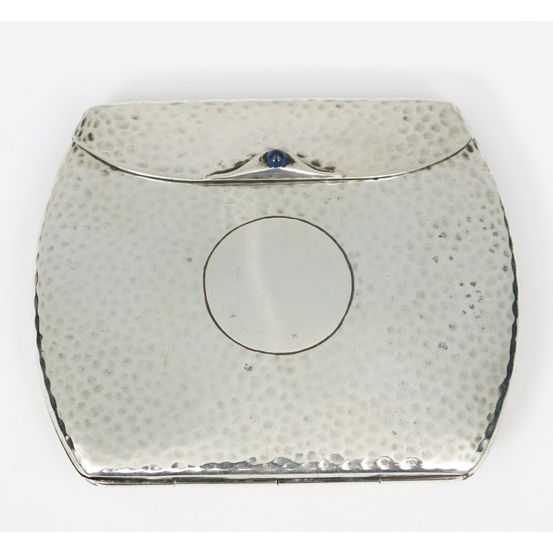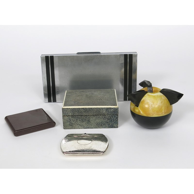 A Cohen & Charles silver cigarette case, hinged, rounded rectangular form, the clasp set with blue glass stone, a shagreen and ivory cigarette box and cover, rectangular form with hinged cover, a Dunlop yellow and black bakelite ash ball, a bakelite cigarette case and a chrome and enamelled metal cigarette box stamped marks, Chester 1907 9cm. high (5)