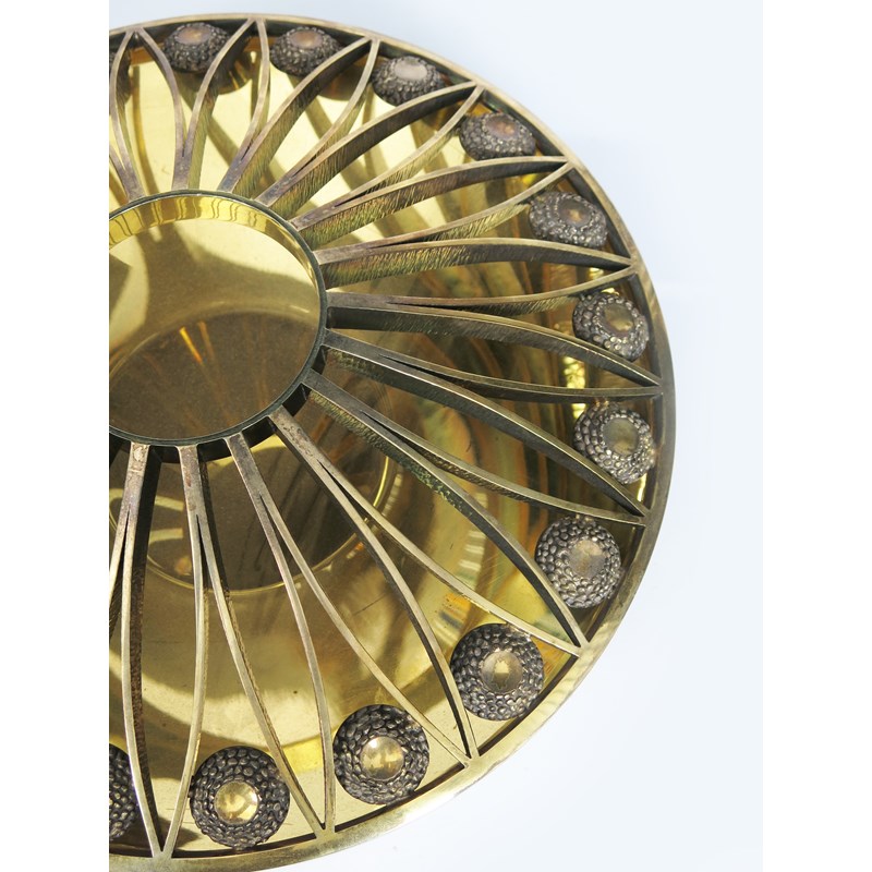 A large and impressive silver gilt rose bowl and cover designed by Stuart Devlin, the low flaring bowl with hammered exterior, the pierced cover with radiating petal motif, set with textured roundels, set with tall tourmaline finial stamped marks, SD London 1968, 36.5cm. diam,