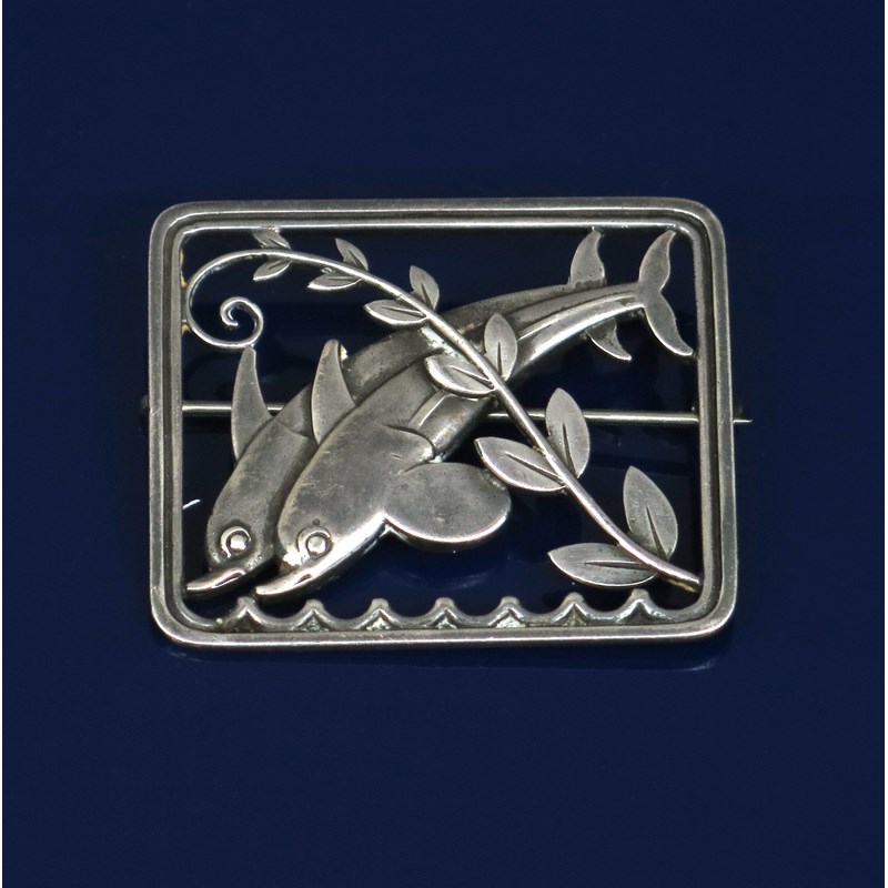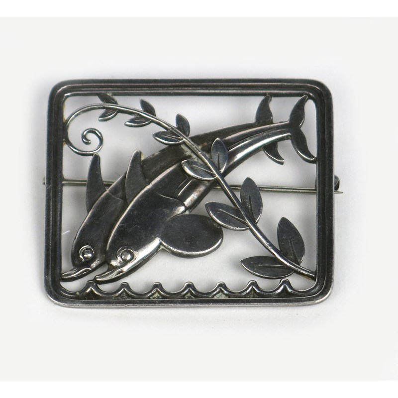 A Georg Jensen silver brooch designed by Arno Malinowski, model no.251, rounded rectangular form, pierced and cast with two leaping dolphins above stylised waves, before a foliate frond stamped marks, London 1959, 3.2cm. wide