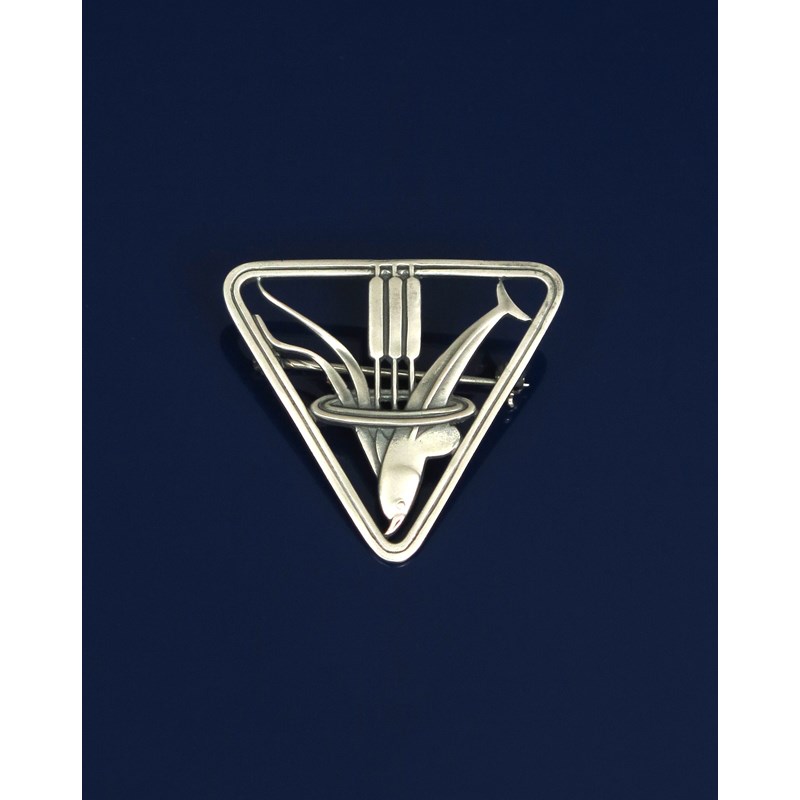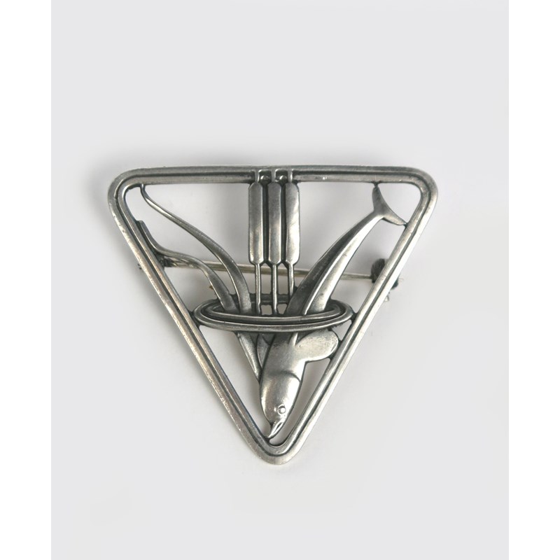 A Georg Jensen silver brooch designed by Arno Malinowski, model no.257, triangular, pierced and cast with a dolphin diving beside bull rush, stamped marks, 4cm. wide.