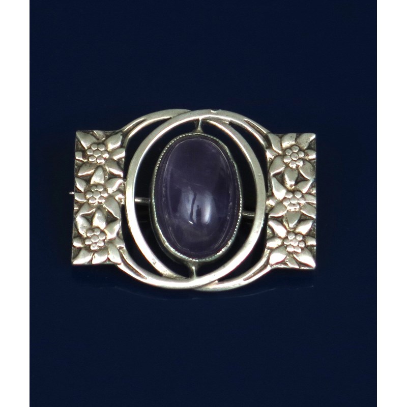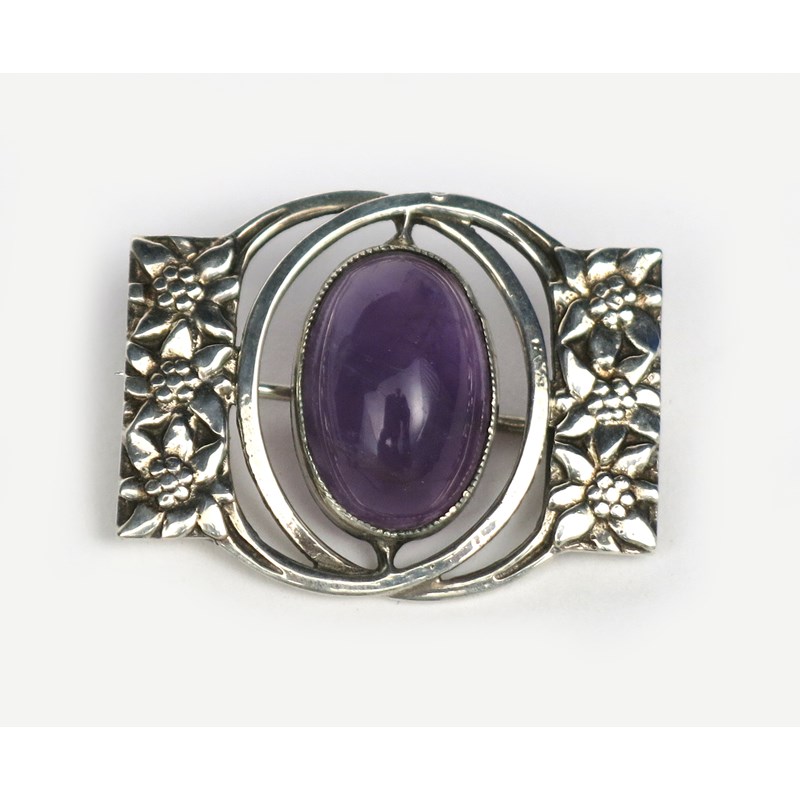A silver and amethyst brooch, probably Norwegian, pierced and cast with foliate panels, set with central stone, stamped 800 RU 3cm. wide