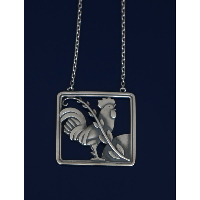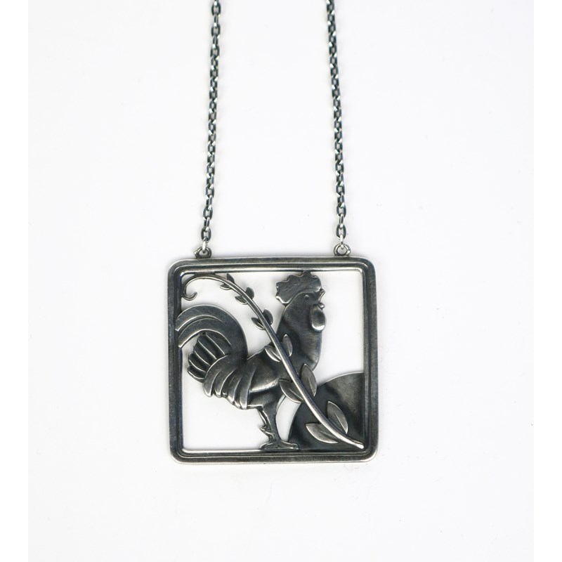 A Georg Jensen silver pendant necklace designed by Arno Malinowski, model no.96, square, pierced and cast with a cockerel, behind a foliate spray, on link chain, stamped marks, 3.7cm. wide