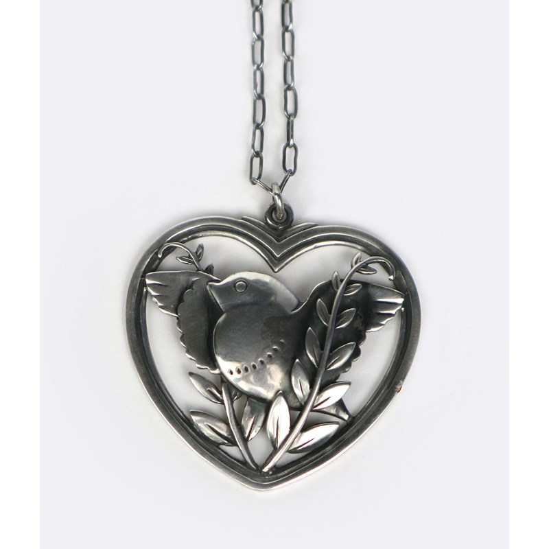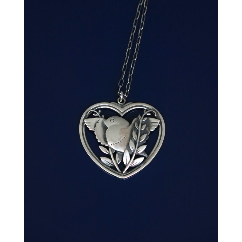 A Georg Jensen silver pendant necklace designed by Arno Malinowski, model no. 97, heart-shaped, pierced and cast with a bird flying between branches, on link chain, stamped marks, 3.5cm. high