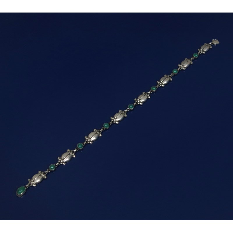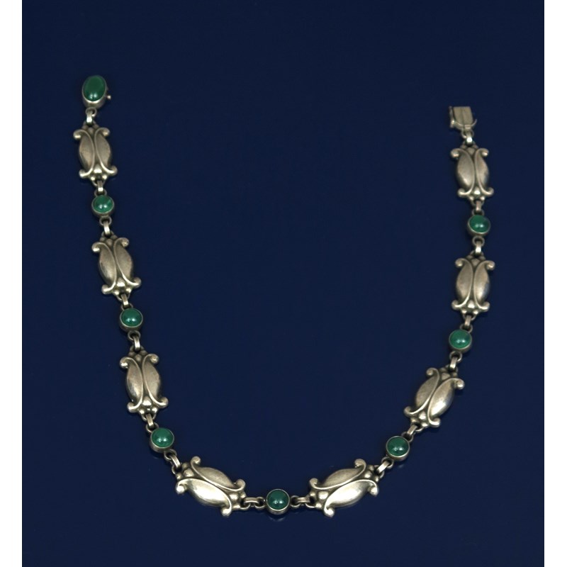 A Georg Jensen silver and chrysoprase Seed and Pod necklace designed by Georg Jensen, model no.15, alternate silver foliate panels and chrysoprase roundels, with box clasp and safety catch stamped marks, 38cm. long