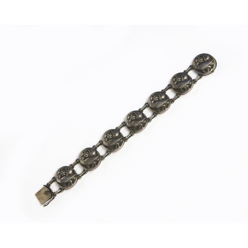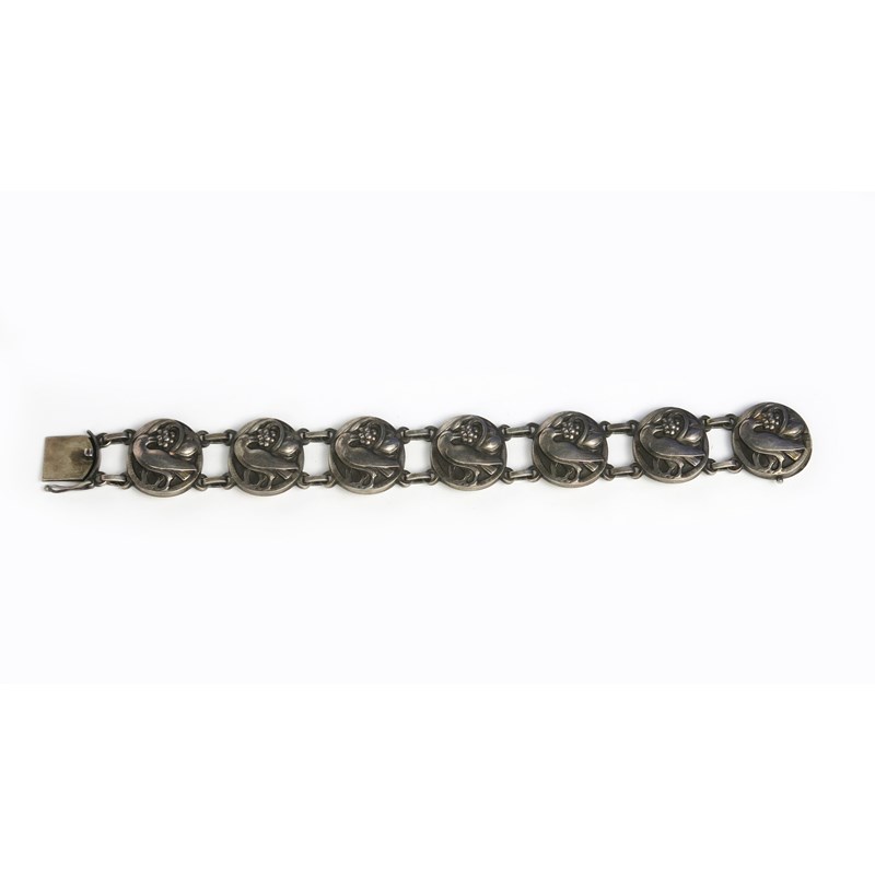 A Georg Jensen silver link bracelet, model no.102, stamped in low relief with a bird pecking at a bunch of grapes and foliage design, stamped marks, 19cm. long