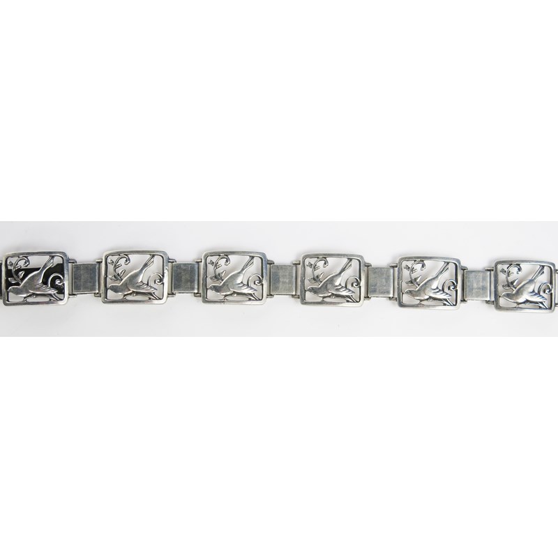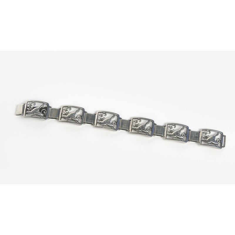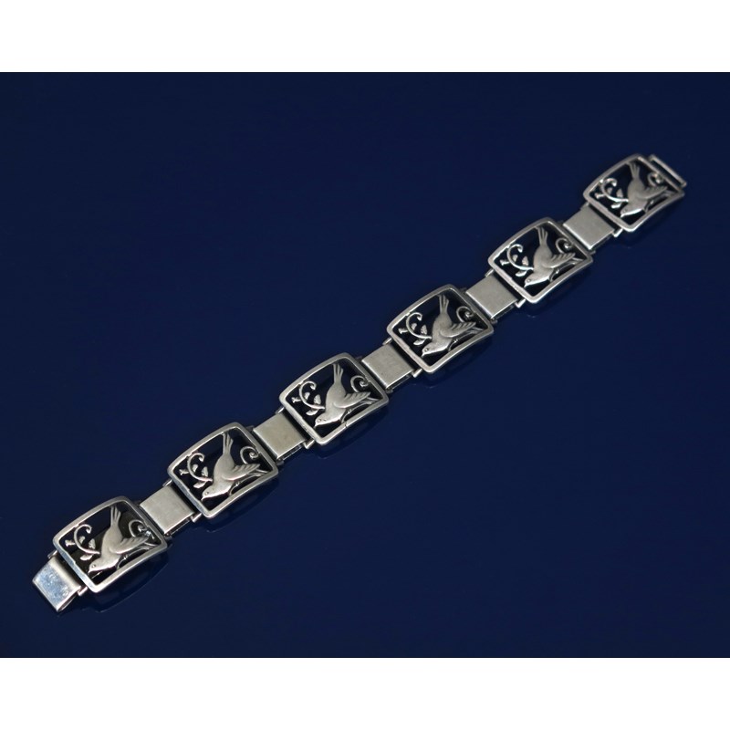 A Scandinavian silver link bracelet, probably by Carl Brumberg Hansen, Denmark, six pierced rectangular panels cast with a bird flying past scrolling foliage stamped CBH 830 S, 18.5cm. wide