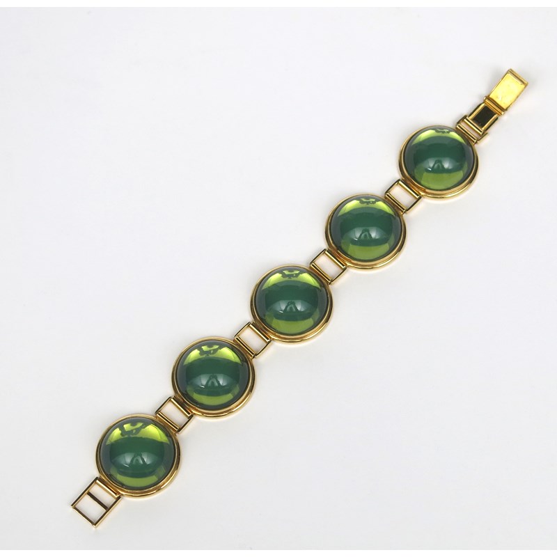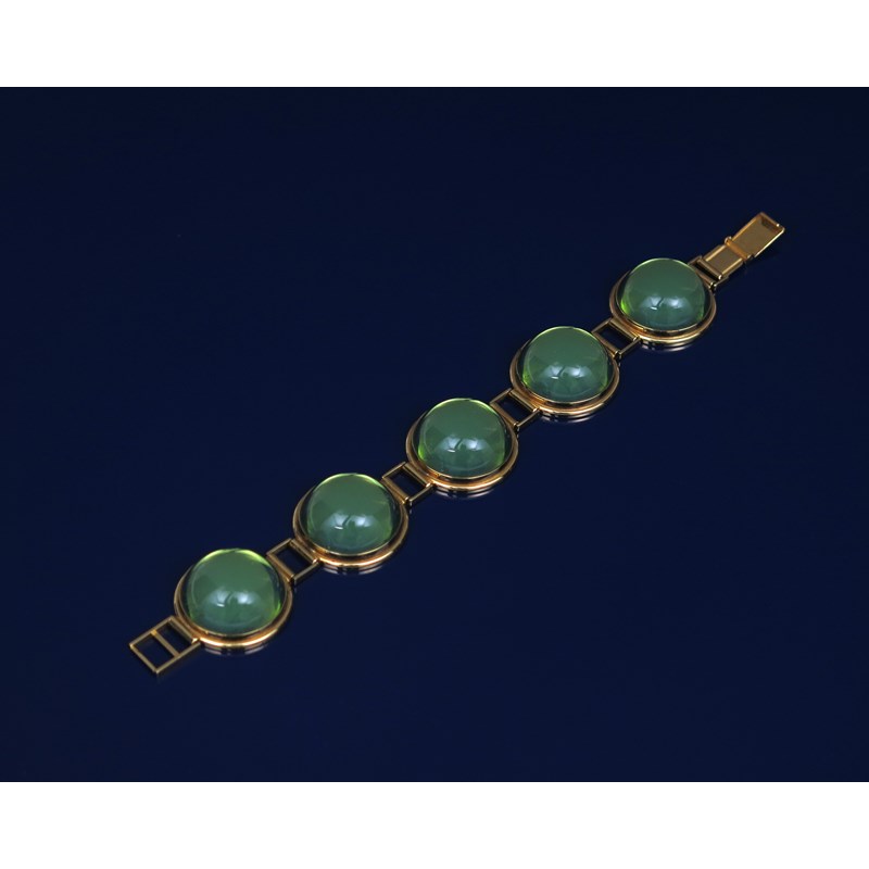 A modern Lalique gilt metal bracelet, five domed green glass panels, stamped Lalique mark, 16.5cm. long.