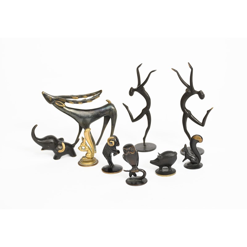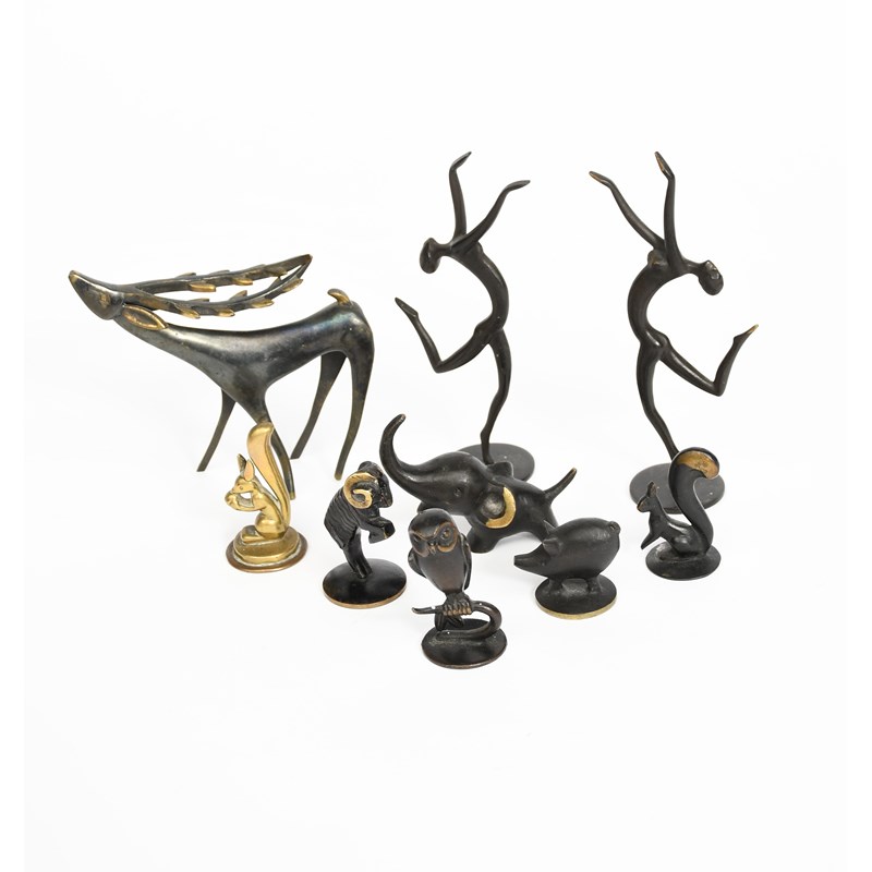 a patinated bronze model of a dancing figure, another similar, an owl perched on a bough and a squirrel all by Rena Rosenthal, and five other similar figures