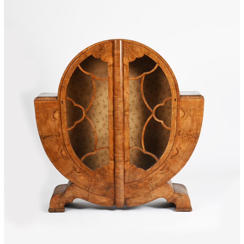 An Art Deco walnut veneer display cabinet, oval form with two hinged glass doors, unsigned, 58cm wide.