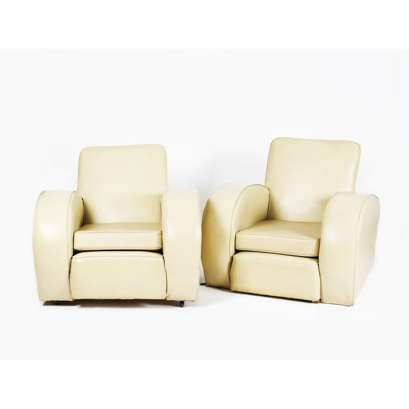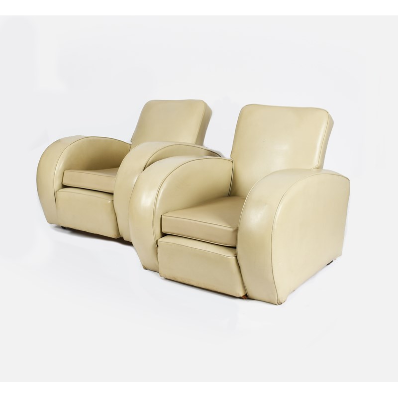 A pair of Art Deco streamlined armchairs, covered in a mushroom leather, unsigned,