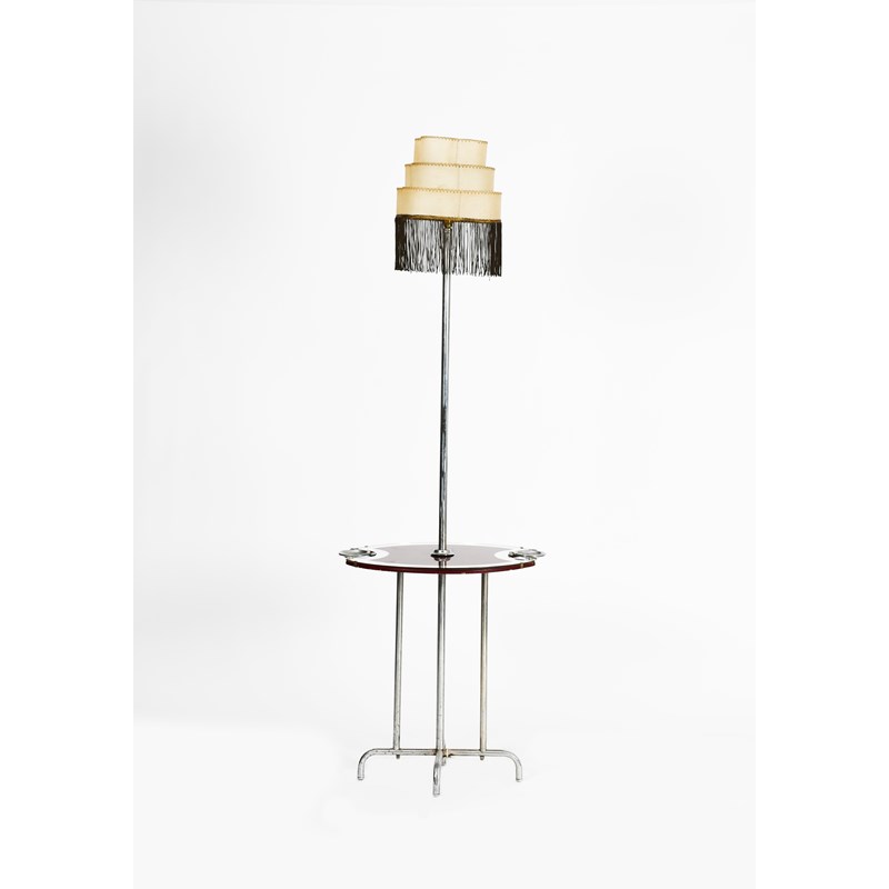 An Art Deco chrome tray table and floor light, the oval tray with two circular ashtrays, unsigned, 176cm. high
