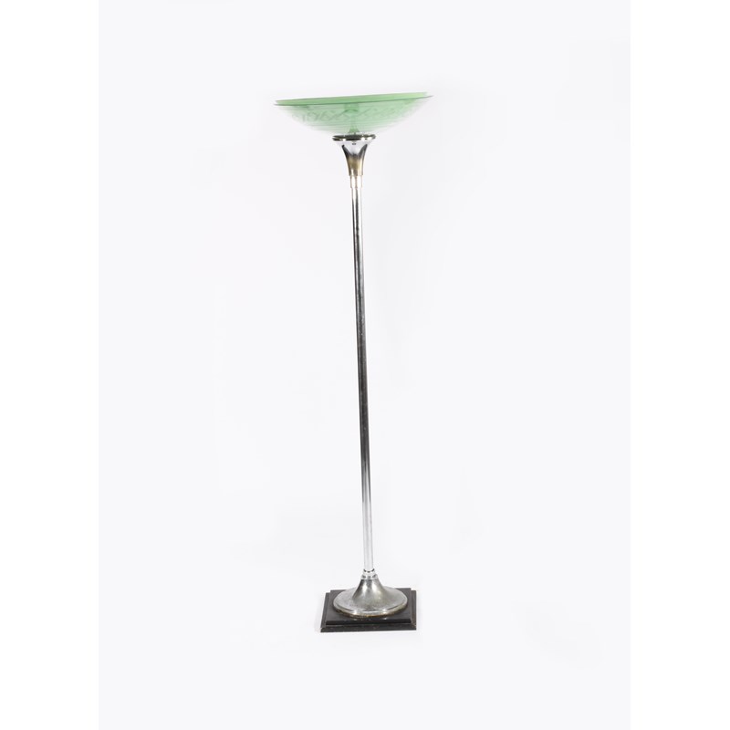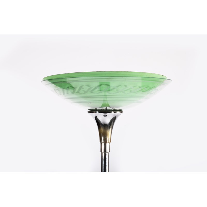 A chrome and glass Savoy uplighter, believed to have been from The Savoy Hotel, stepped ebonised wood base, tapering chrome column flaring to support clear and frosted glass shade frosted with repeat S motif, with enamelled green inner uplighter shade, unsigned 193cm. high
