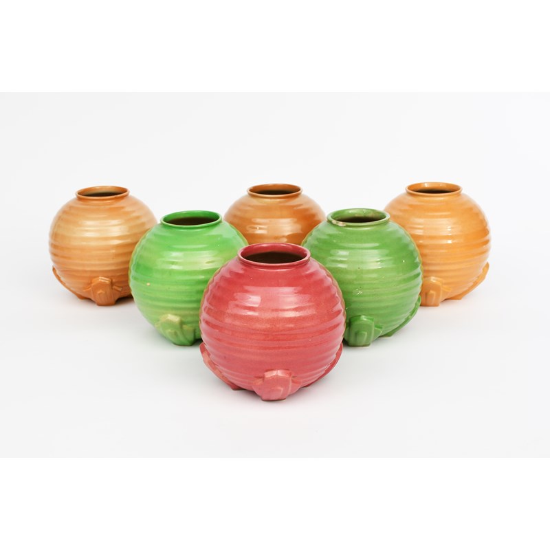 Four Art Deco Fiesta Ware jugs, streamlined form two blue, one white and one salmon pink, a watering can jug similar, and six Art Deco spherical vases,
