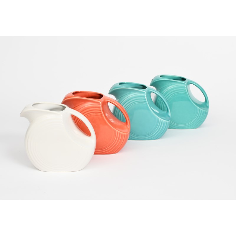 Four Art Deco Fiesta Ware jugs, streamlined form two blue, one white and one salmon pink, a watering