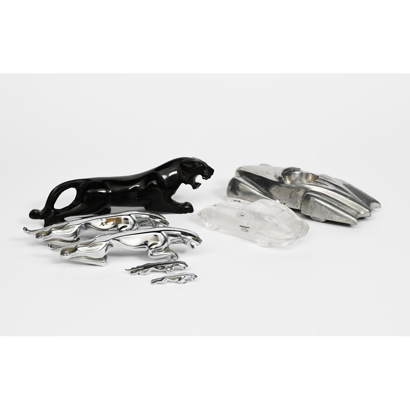 A Polished pewter model of a streamlined sports car, a modern Hof Bauer glass model of a sports car, two chrome plated Jaguar car mascots originally designed by Frederick Gordon Crosby, two smaller, and a black glass panther, unsigned, 21.5cm. wide (pewter car), (7)