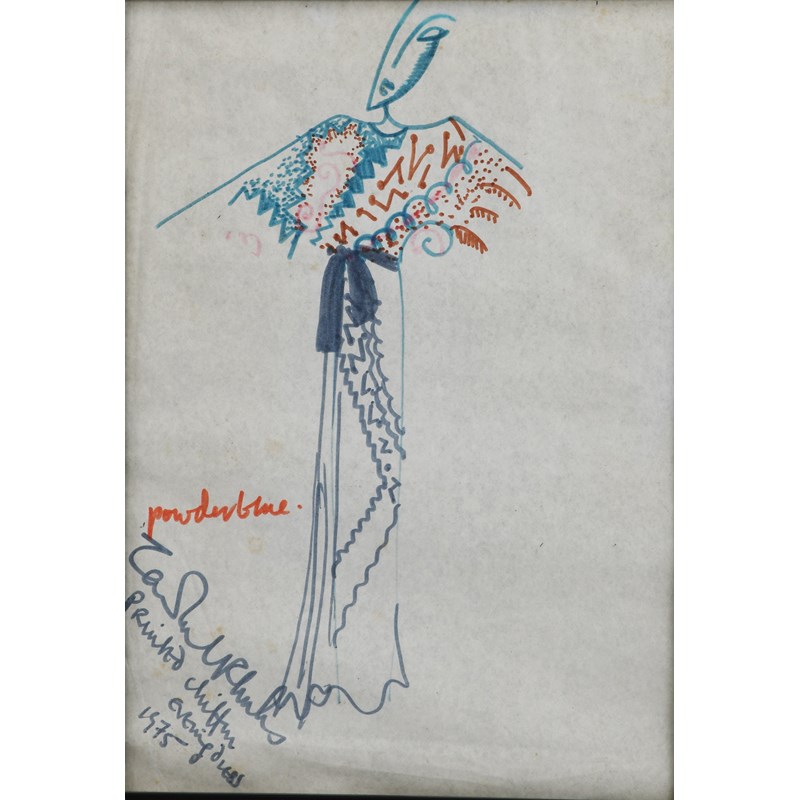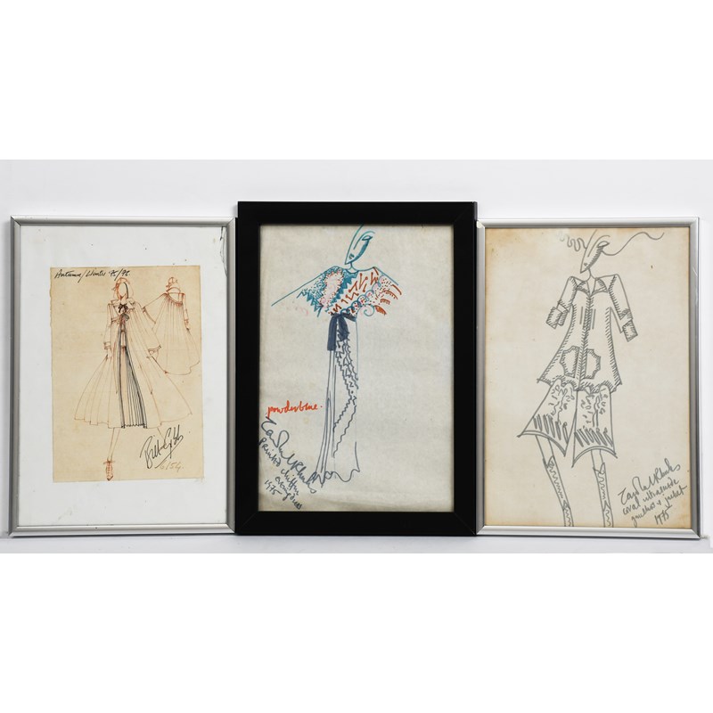 an original costume design, another titled Coral ultrasuede gauchos and jacket, 1975, and a dress design by Bill Gibb, dated 1975-76 Autumn-Winter, framed