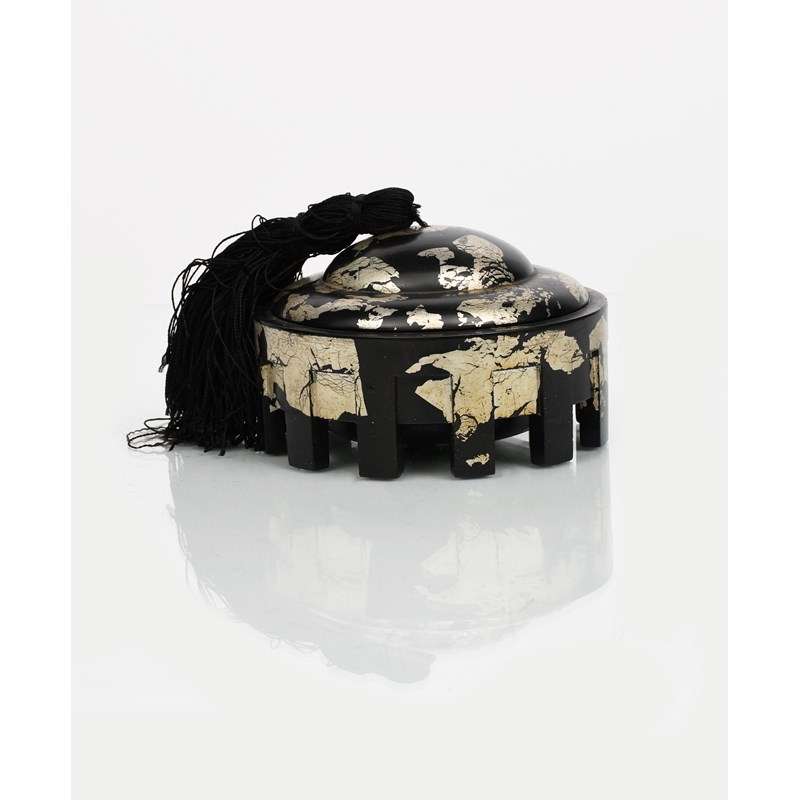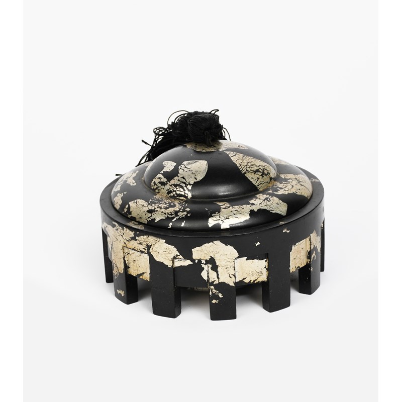 An Art Deco bakelite box and cover, black with silver panels, the domed cover with black silk tassel, the base circular on twelve rectangular feet, unsigned 13.5cm. diam.