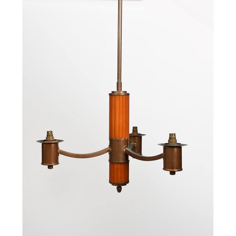 An Art Deco bakelite and copper three light electric ceiling light, the tapering, fluted bakelite