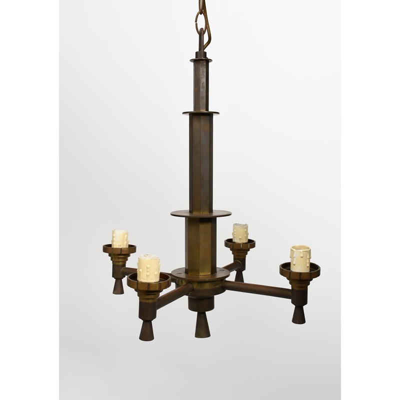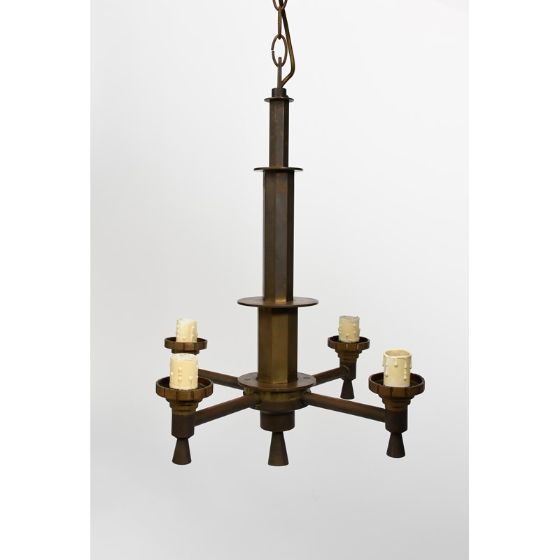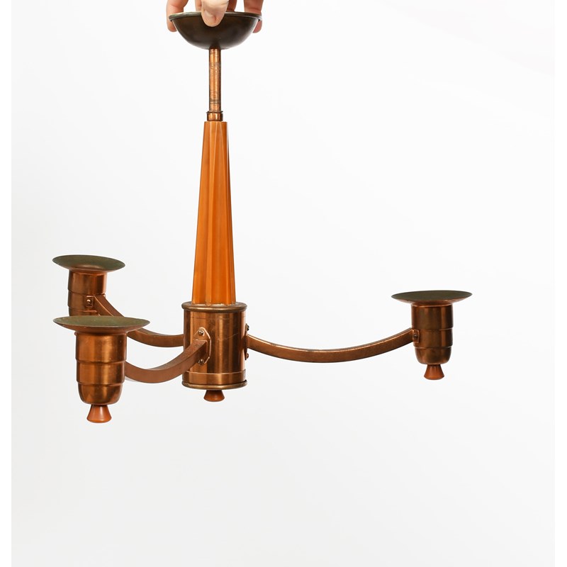 An Art Deco bakelite and copper three light electric ceiling light, the tapering, fluted bakelite stem supporting three radiating copper arms with sconce and bakelite finials, another similar and another Art Deco four light electric ceiling light, unsigned, 38cm. high (main), (3)