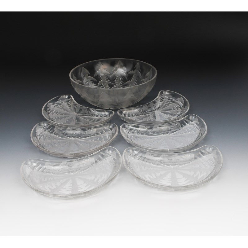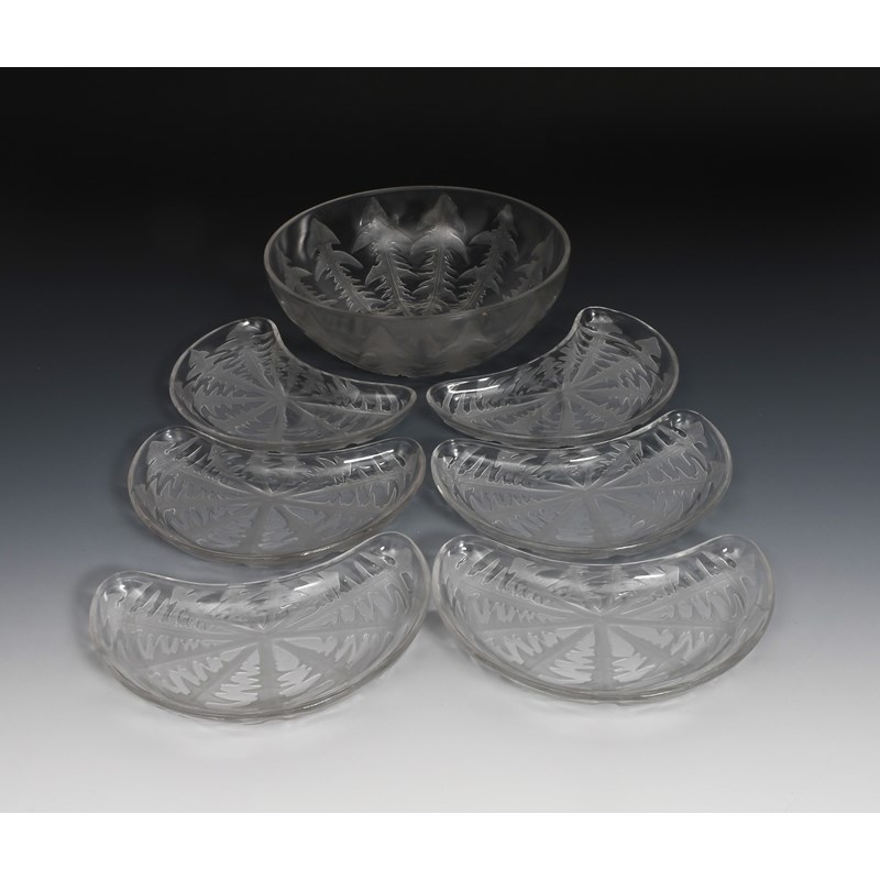 'Pissenlit' no.3215 a Lalique clear and frosted glass bowl and six crescent plates designed by Rene Lalique, cast R Lalique France to the well, 24cm. diam. (7)