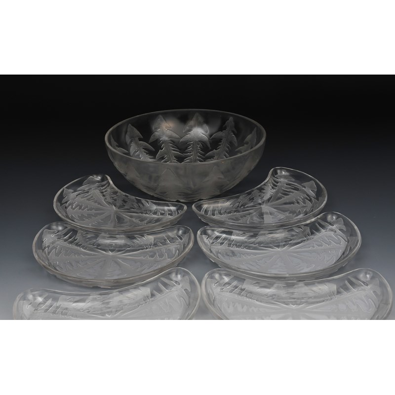 'Pissenlit' no.3215 a Lalique clear and frosted glass bowl and six crescent plates designed by Rene
