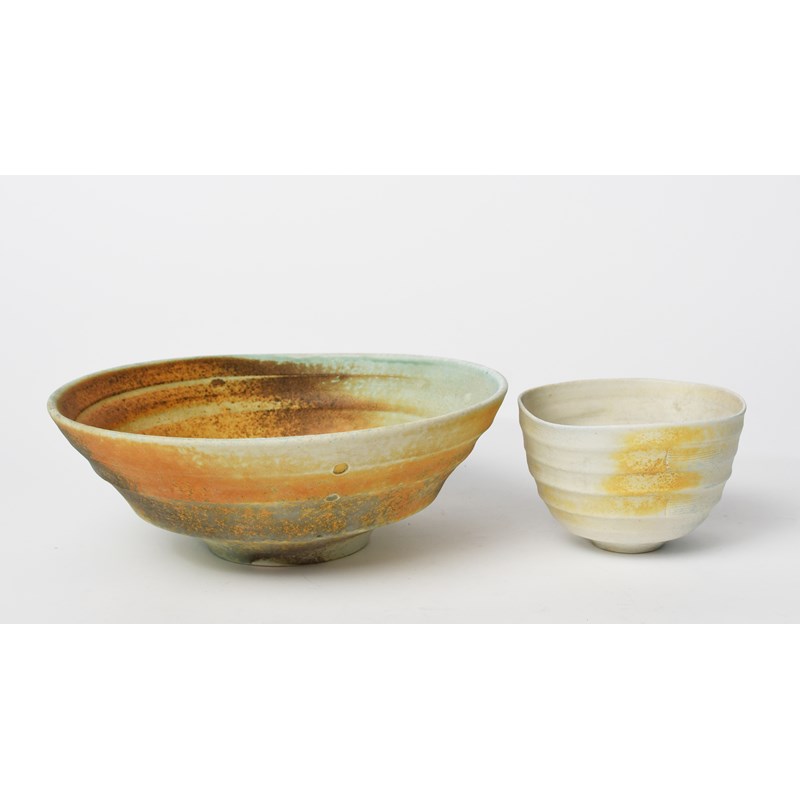 porcelain, flaring, conical form with impressed decoration, with soda vapour glaze, and another square section bowl