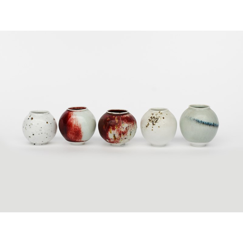 porcelain glazed white and streaked sang de bouef to shoulder, another similar and three other Moon jars