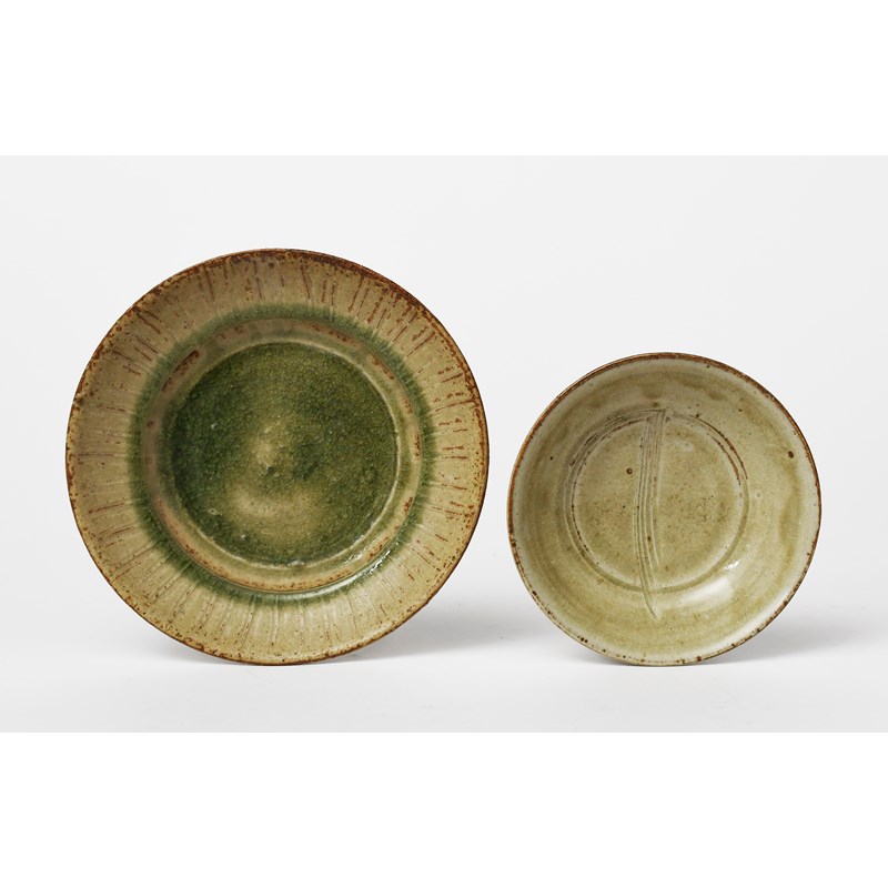 stoneware, covered in an ash glaze with iron spots, incised comb decoration to well, and another stoneware plate