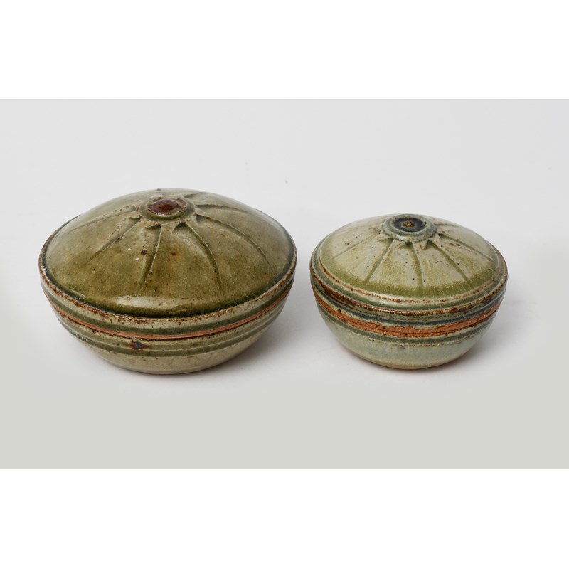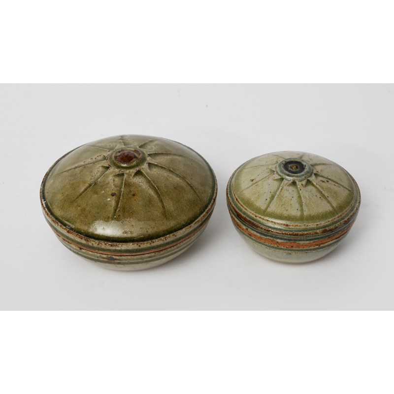 stoneware, the cover with star motif, covered in an ash glaze, and another smaller by Richard Batterham