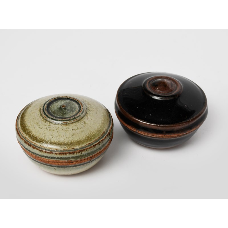 stoneware, covered in a dark iron glaze, and another by Richard Batterham covered in an ash glaze