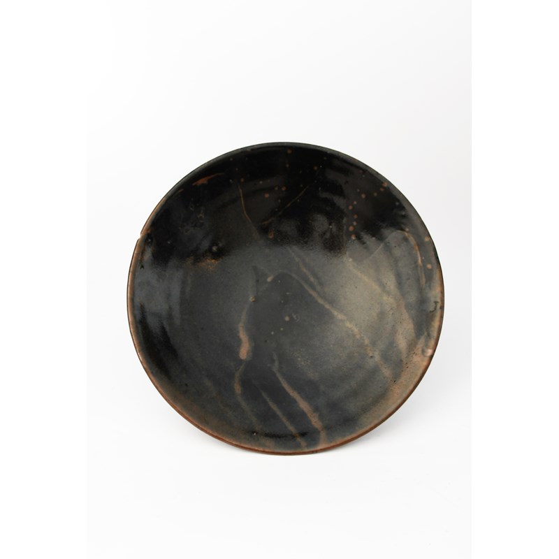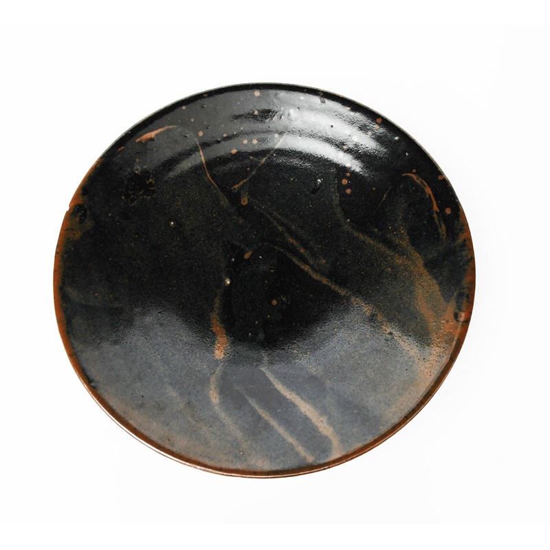 a stoneware charger resist decorated with a ghostly figure, in tenmoku,