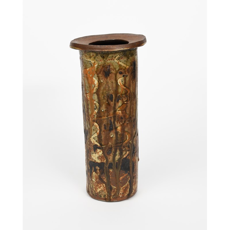 Leach Pottery stoneware cylinder with flaring rim, running glaze
