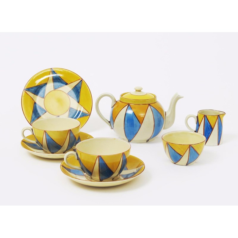 'Original Bizarre' a Clarice Cliff Globe tea for two, painted with blue and yellow triangles, outlined in orange, comprising teapot and cover, milk-jug and sugar basin, two cups, saucers and a side plate printed factory marks, 11cm. high (9)