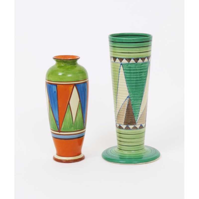 'Killarney' a Clarice Cliff Bizarre 613 vase, painted in colours, and an Original Bizarre vase printed factory marks, Original Bizarre vase 21.5cm. high (2).