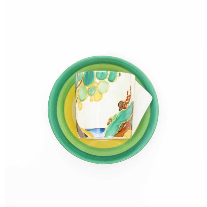 'Secrets' a Clarice Cliff Bizarre Conical coffee can and saucer, painted in colours, the saucer with green and yellow bands printed marks, professional restoration to can, 7cm. high (2)