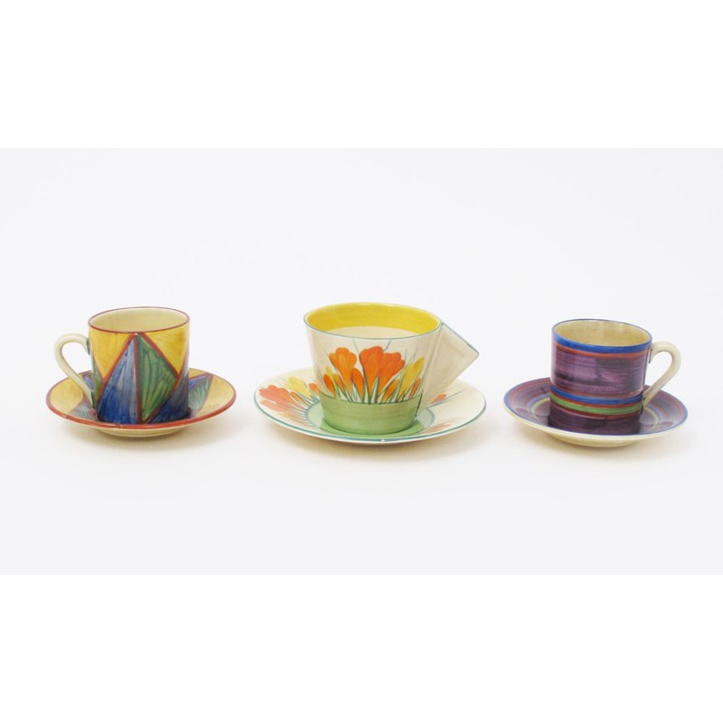 'Sungleam Crocus' a Clarice Cliff Bizarre Conical demi tasse cup and saucer, painted in shades of orange, yellow and green, and two Original Bizarre printed factory marks, 13cm. diam. (3)