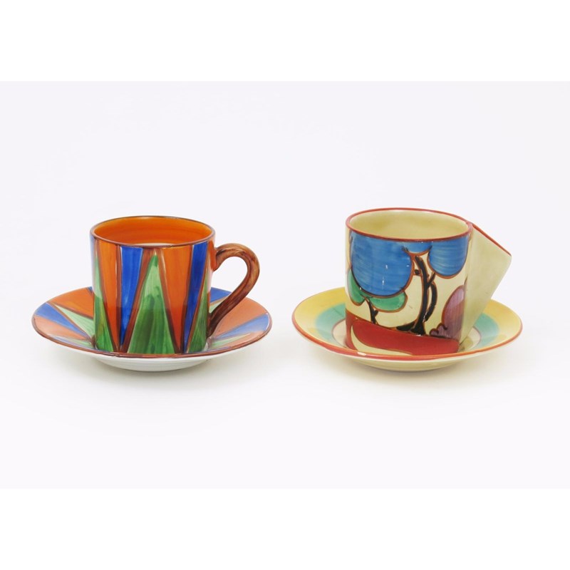 'Autumn' a Clarice Cliff Fantasque Bizarre Conical coffee can and saucer, painted in colours and an 'Original Bizarre' Tankard coffee can and saucer printed marks, 7cm. high (2)