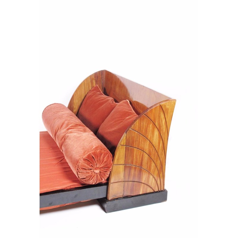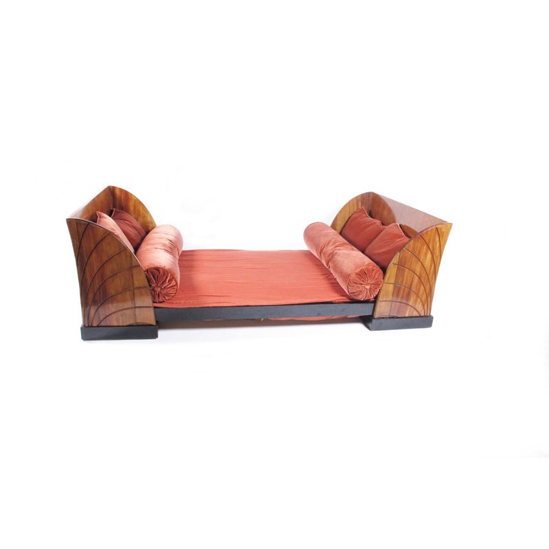 A Marcel C. Coard walnut day bed, with curved wave ends, ebonised wood frame, velvet upholstered cushions, 219 x 128, stamped mark, 70cm. high