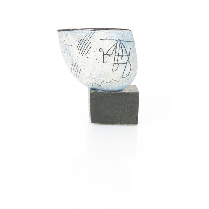 a stoneware cup form vase, enamelled with ships at sea, in white and brown on a blue ground, the angled vase on rectangular pottery base painted Maltby 17cm. high