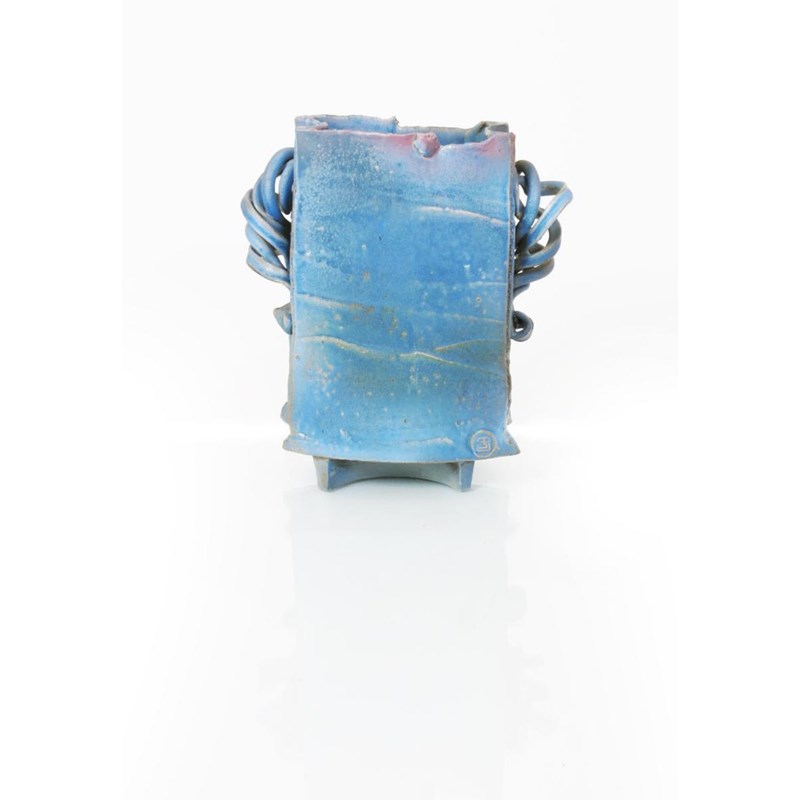 a stoneware winged pot, rectangular form, applied with entwined handles, covered in a pale blue and pink glaze impressed seal mark, 26cm. high