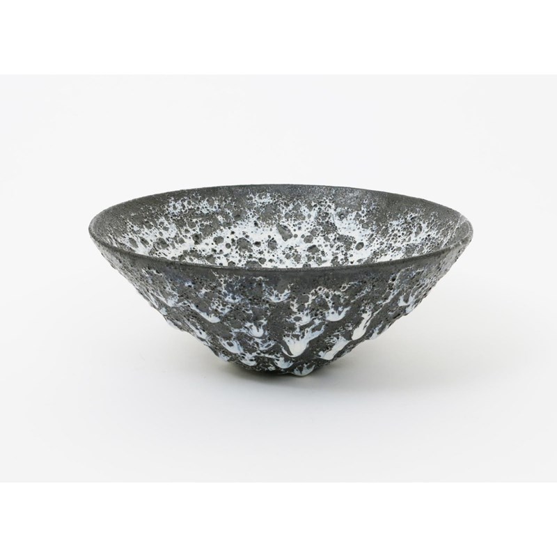 a stoneware flaring bowl, covered in a running, volcanic white glaze, impressed seal mark, applied paper exhibition label, 31.5cm. diam.