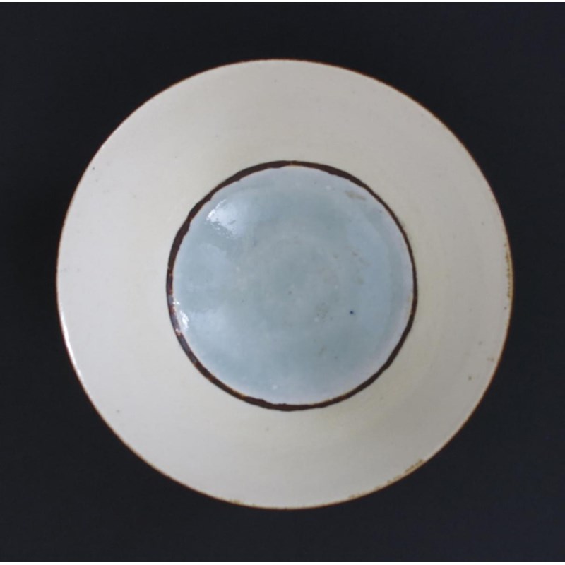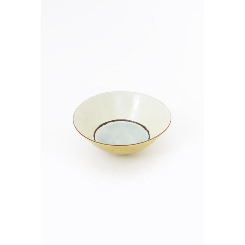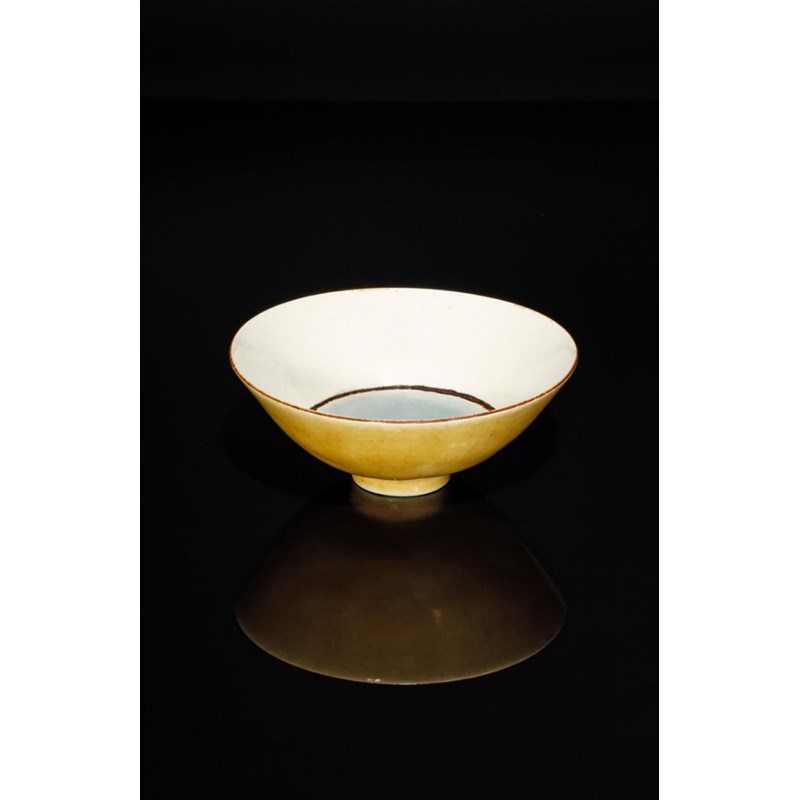 an early porcelain footed bowl, the flaring conical bowl glazed yellow to the exterior, the interior translucent with a manganese band and a blue celadon well, the rim highlighted with manganese impressed seal mark, 16.3cm. diam. 6.5cm. high