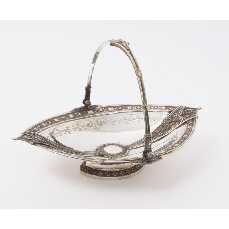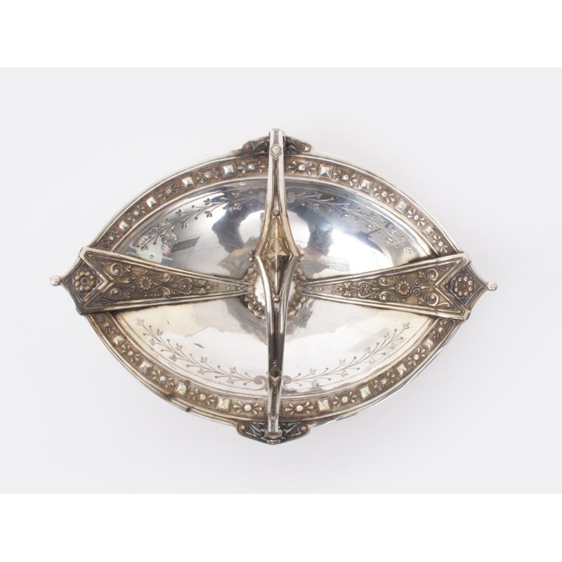 An Elkington Aesthetic Movement tazza with hinged handle, model no.10092, in the manner of Dr Christopher Dresser, cast in low relief with floral bands and borders stamped marks and regd 35cm. wide
