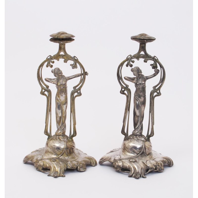 A pair of W.M.F electroplated tazza bases, each modelled with an Art Nouveau maiden rising from a domed turbulent base with berried foliage sprays stamped marks, glass bowls missing 33.5cm. high (2)