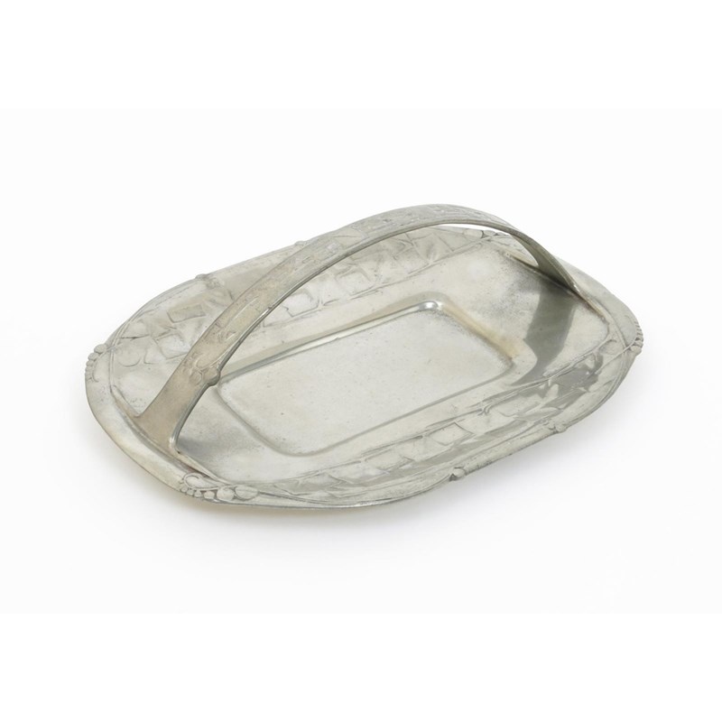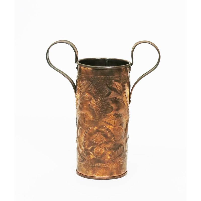 An Arts and Crafts copper vase probably by John Williams, cylindrical form with two strap handles, repousse hammered with scrolling foliage, and a Liberty & Co Tudric pewter tray vase, unsigned 29.5cm. high (2)